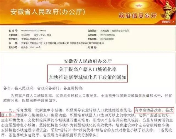 12月6日,安徽省政府发文《关于提高户籍人口城镇化率加快推进新型城镇化若干政策的通知》。