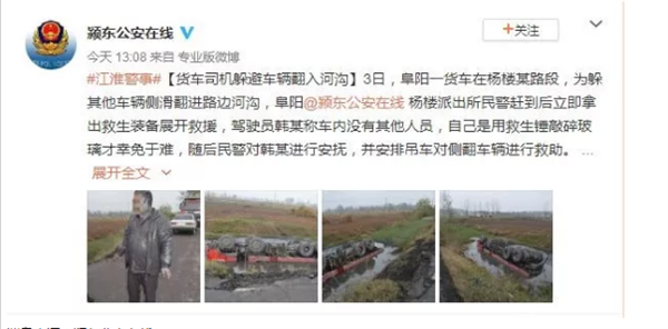 阜阳一货车翻入河沟四脚朝天,司机成功逃生全因“它”! ?